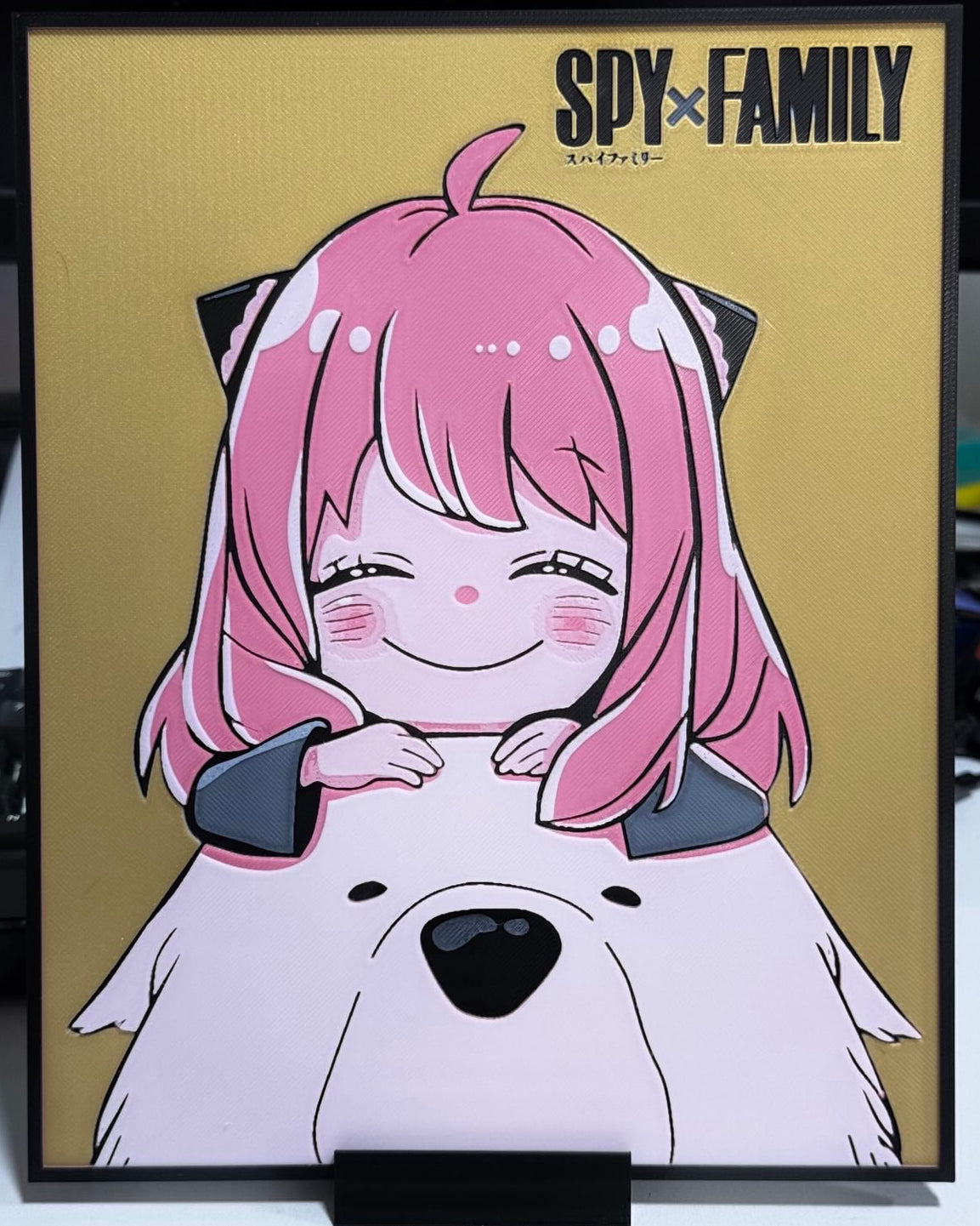 Print inspired by Loid, Yor, and Anya Forger from Spy x Family, presented in a vibrant layered style that emphasizes their iconic family portrait composition, expressive faces, and warm pastel palette. Layer depth brings out the clean linework, soft shading, and playful energy that define this beloved trio.