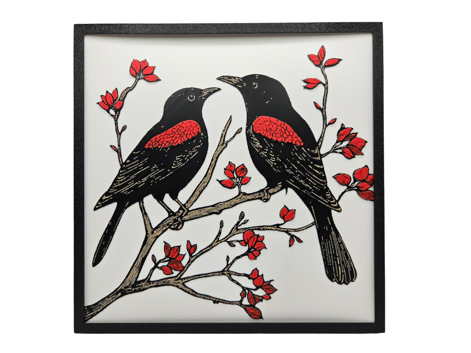 A layered 3D Strata Print featuring two red-winged blackbirds perched on delicate branches adorned with bright red blossoms. Layered filament depth brings out the striking contrast of their black plumage, bold shoulder patches, and the textured bark and petals, creating a warm and elegant nature piece.