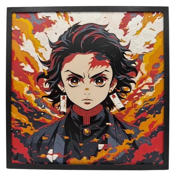 A layered 3D Strata Print inspired by Tanjiro, surrounded by a burst of fiery reds, oranges, and golds that radiate from behind him. Layer depth sharpens his intense expression, signature hanafuda earrings, and the bold lines of his Demon Slayer uniform. The swirling flames amplify the sense of resolve and power, giving the whole piece a dramatic, anime-perfect punch.
