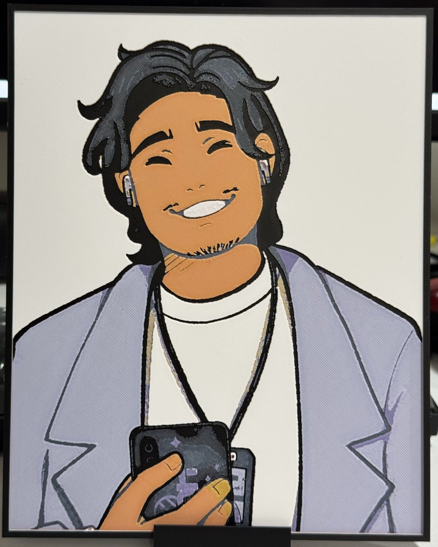 Print inspired by Bobby from K-Pop Demon Hunters, illustrated in a clean, modern casual style with a bright smile, relaxed pose, and soft lavender jacket tones. Layer depth highlights his expressive features, smooth shading, and the reflective phone details, giving the piece a warm, polished, character-focused look.