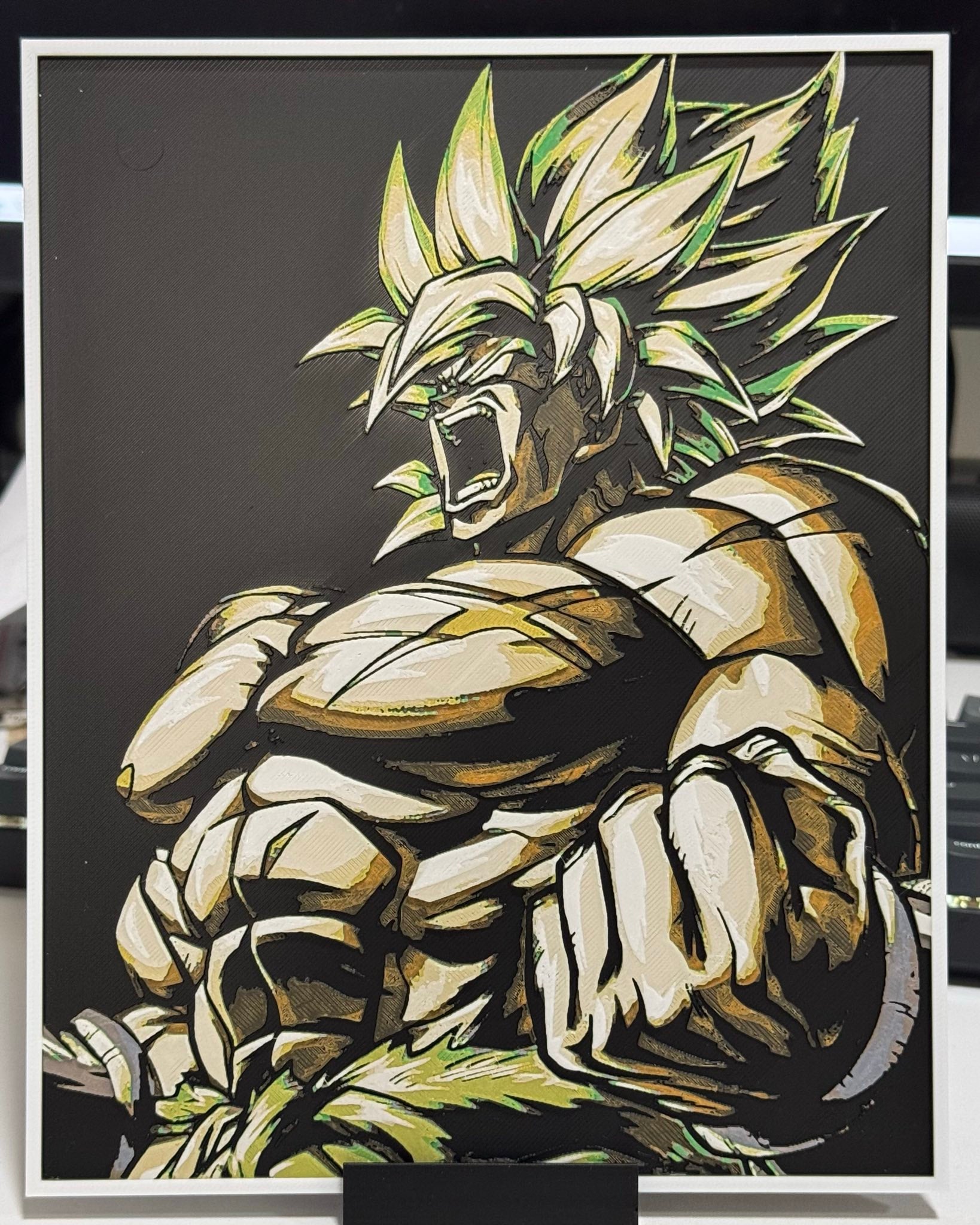 Print inspired by Broly from Dragon Ball, showcasing his explosive Legendary Super Saiyan form with massive muscle definition, wild green-tinted hair, and a roaring, battle-ready expression. Layer depth amplifies the sharp highlights, bold linework, and swirling energy accents, giving the entire piece an intense, high-impact presence worthy of the Saiyan berserker.