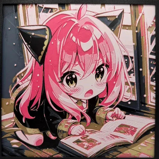 A layered 3D Strata Print inspired by Anya Forger, illustrated in an adorable chibi style overflowing with bright pink tones and warm, storybook charm. Layer depth brings out the soft flow of her hair, the expressive sparkle in her eyes, and the cute cat-ear accessories as she lies on the floor engrossed in her book. The cozy interior backdrop, gentle lighting, and playful details give this piece an irresistibly sweet, heart-melting presence perfect for any Spy x Family fan.