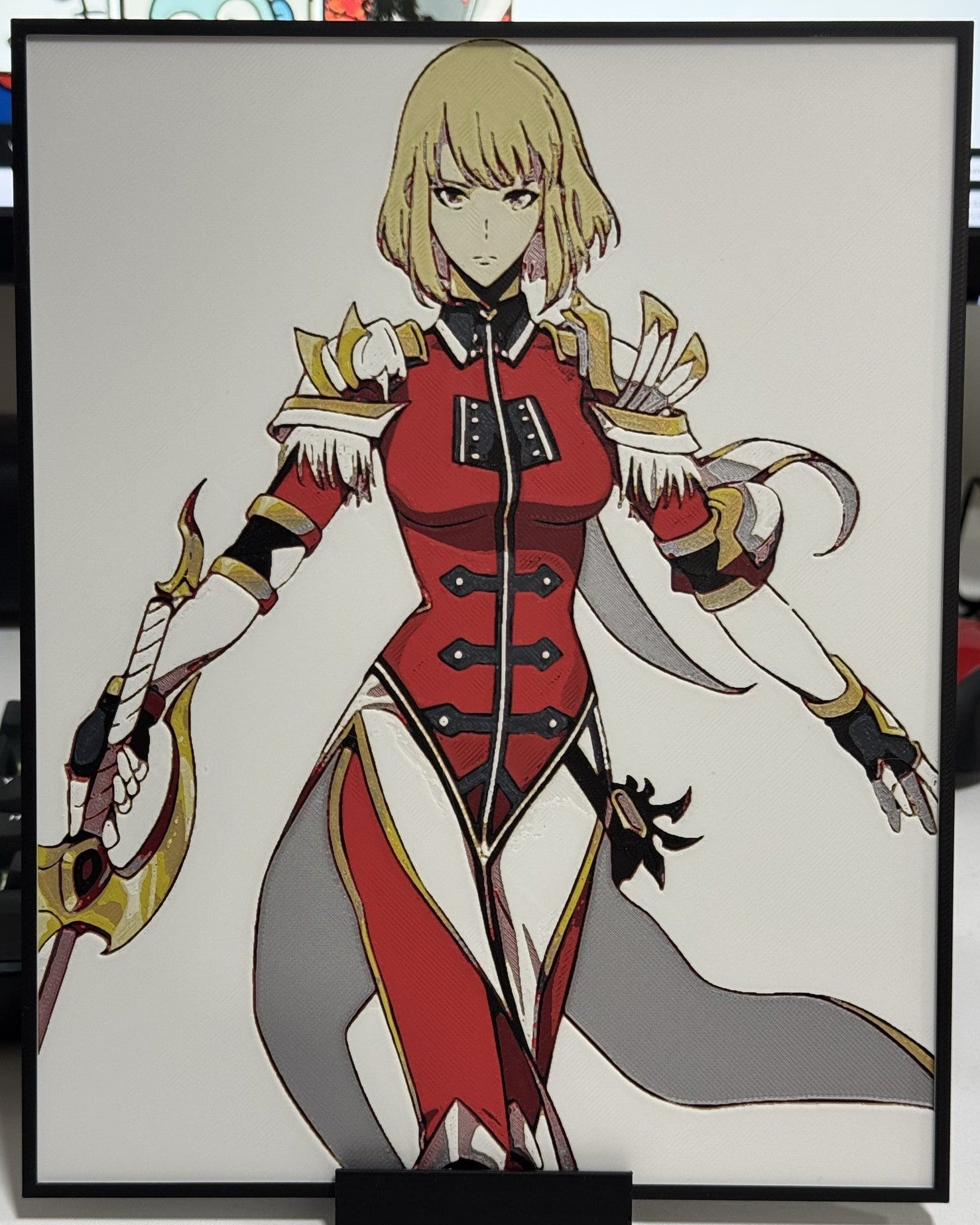 Print inspired by Cha Hae-In from Solo Leveling, featuring her red-and-white armored raid attire, flowing cape edges, and poised stance with her golden blade. Layer depth enhances the sharp linework, metallic highlights, and clean color contrasts, giving the portrait a powerful, elegant presence true to the S-Rank Hunter.