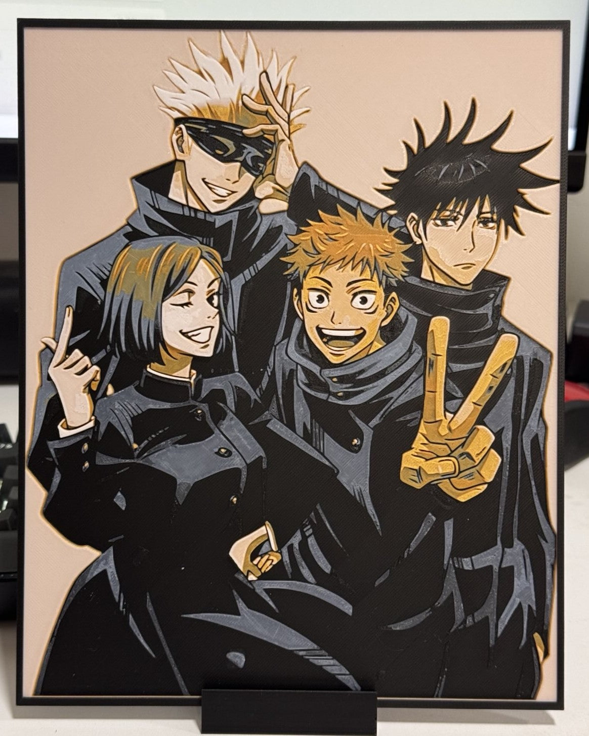 Print inspired by Gojo Satoru, Nobara Kugisaki, Yuji Itadori, and Megumi Fushiguro from Jujutsu Kaisen, captured in a vibrant, energetic layered style. Depth and color bring out Gojo’s playful confidence, Nobara’s bold attitude, Yuji’s infectious smile, and Megumi’s calm intensity. The rich blacks and gold accents give the whole piece a striking, unified look perfect for fans of the first-year squad.