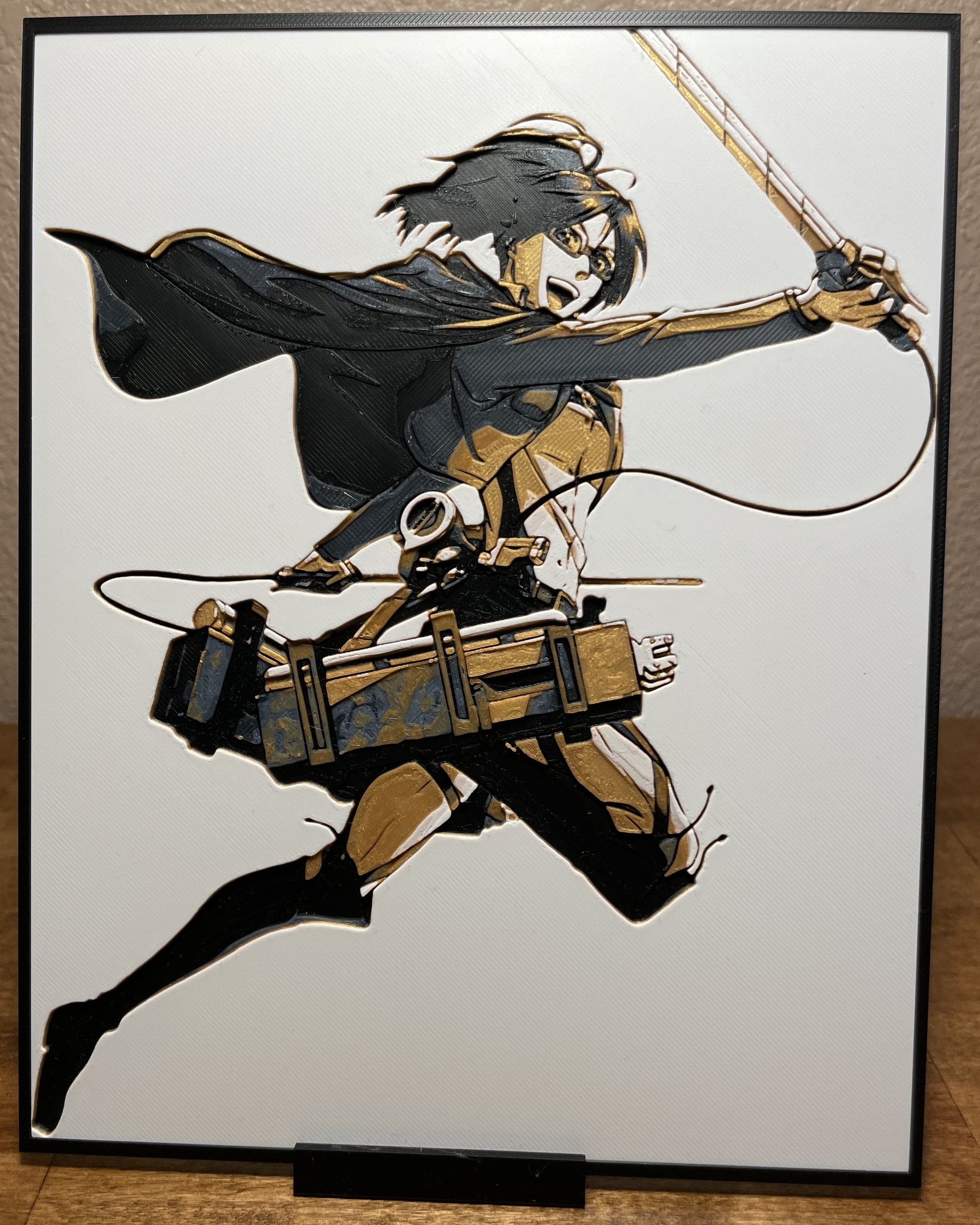 Print inspired by Hange Zoë from Attack on Titan, presented in a vibrant layered style that emphasizes her airborne strike pose, expressive intensity, and signature dual-blade combat. Layer depth brings out the flowing cape, sharp ODM gear details, and bold contrasts that define this fan-favorite character’s dynamic style.