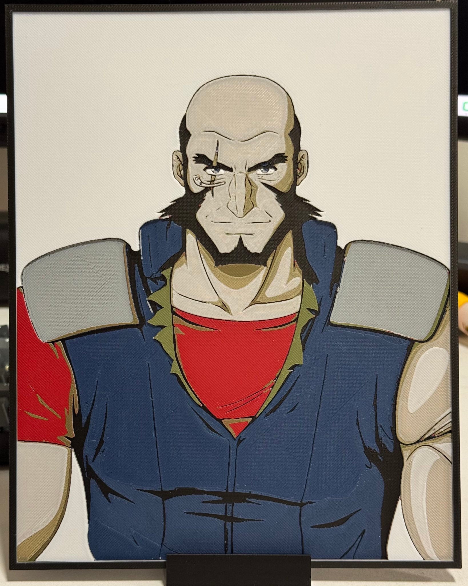 A layered 3D print inspired by Jet Black from Cowboy Bebop, capturing his steady presence, cybernetic details, and the tough, grounded expression that defines the crew’s veteran ex-cop.