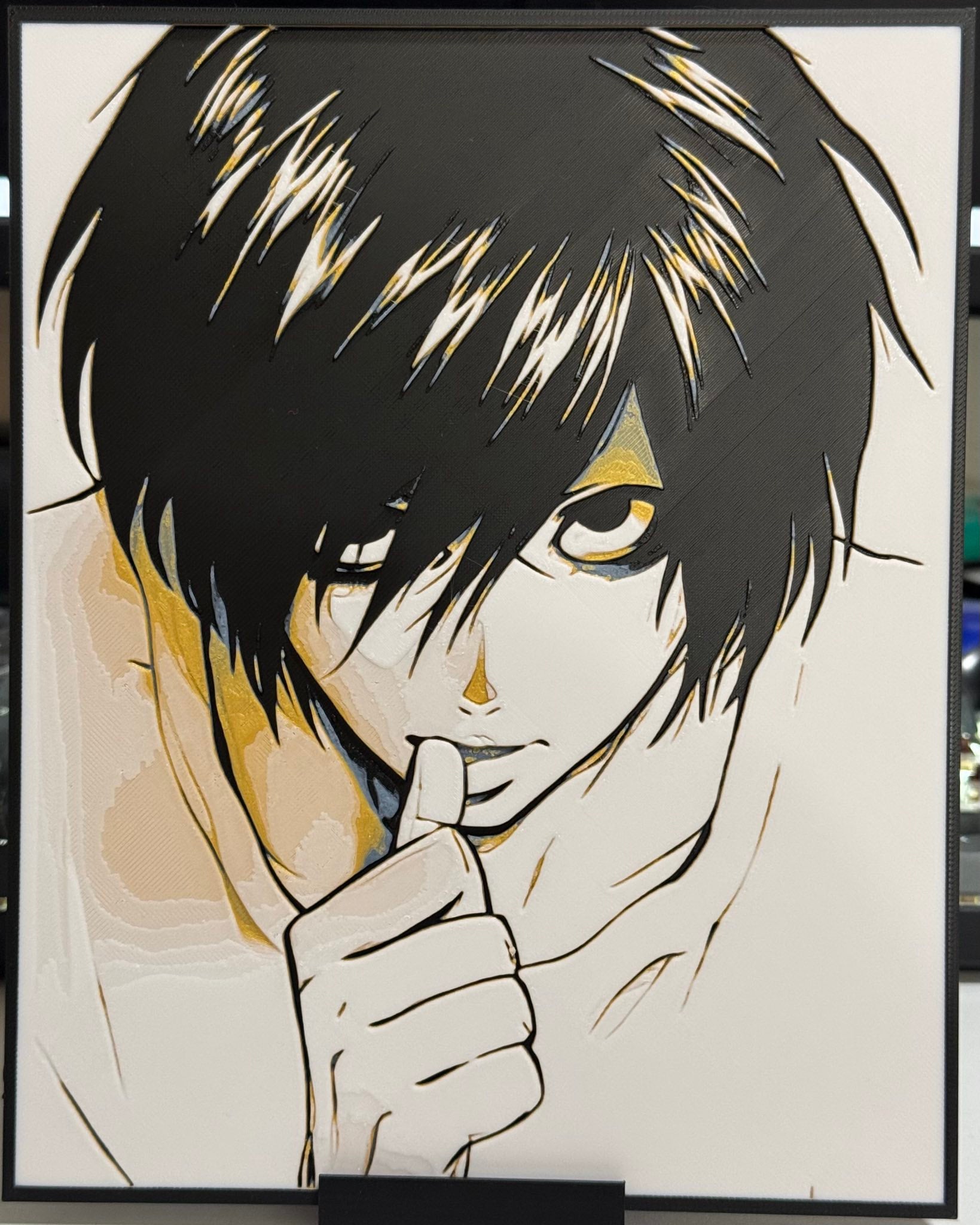 Print inspired by L from Death Note, capturing his iconic crouched posture, intense gaze, and quiet analytical presence. Layer depth emphasizes his tousled black hair, sharp shadows, and the subtle tension in his thoughtful pose, giving the piece a moody, detective-noir energy.