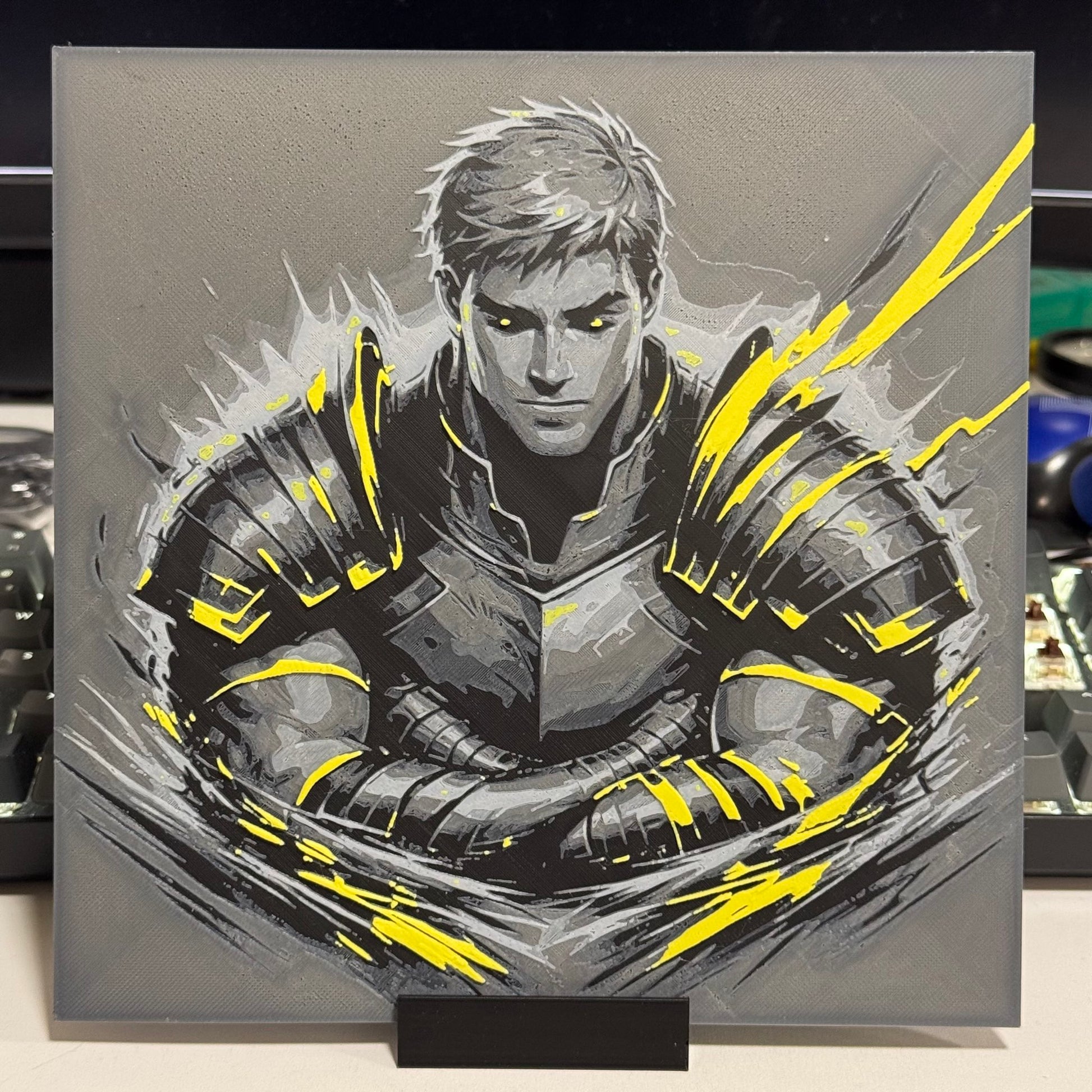 A layered 3D print inspired by Laios from Dungeon Meshi (Delicious in Dungeon), featuring his intense stare, heavy armor, and crackling yellow energy bursting across the grayscale palette for a dramatic, magical effect.