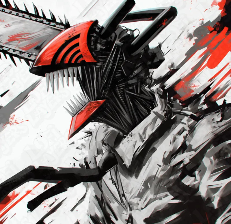 A layered 3D Strata Print inspired by Chainsaw Man (Denji), presented in a brutal black-and-white Color Pop style with intense red highlights. Layer depth emphasizes the jagged chainsaw blades, sharp teeth, and the explosive blood-splatter motion tearing across the scene.
