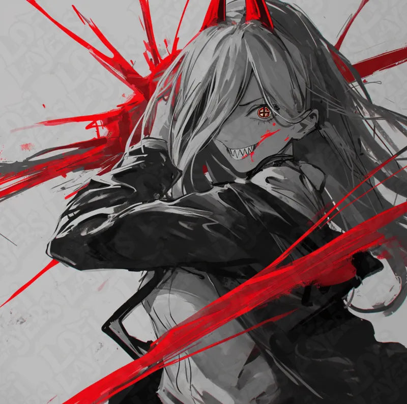 A layered 3D Strata Print inspired by Power from Chainsaw Man, presented in a sharp black-and-white Color Pop style with striking red highlights. Layer depth emphasizes her fierce expression, pointed horns, flowing hair, and the chaotic burst of blood-splatter energy slicing across the scene.