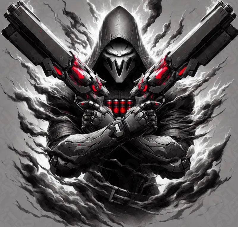A layered 3D Strata Print inspired by Reaper from Overwatch, presented in a dark, high-contrast black-and-white Color Pop style with intense red highlights. Layer depth emphasizes his iconic mask, crossed Hellfire Shotguns, and the swirling shadowy smoke enveloping his silhouette.