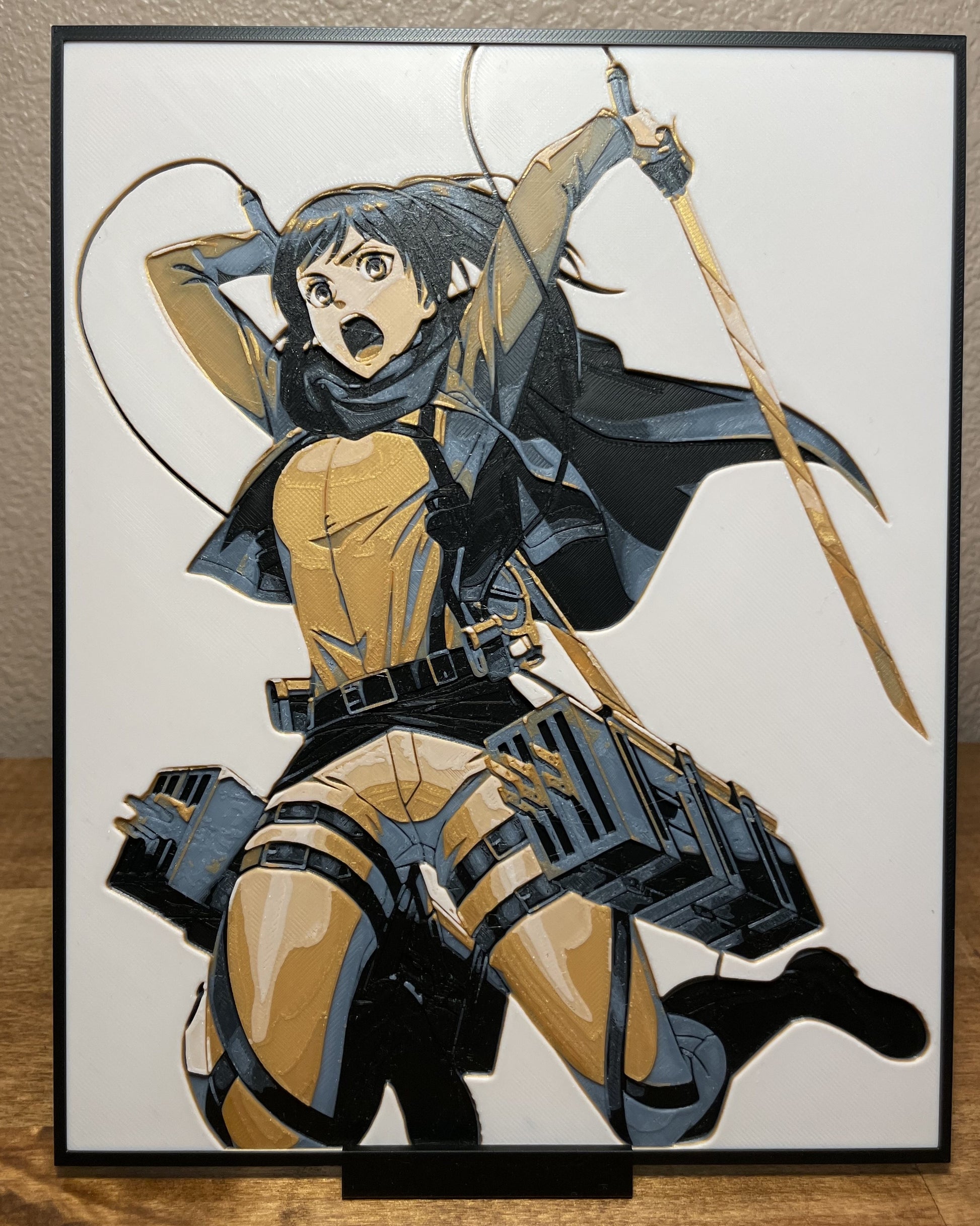 Print inspired by Sasha Blouse from Attack on Titan, presented in a vibrant layered style that emphasizes her airborne pose, determined expression, and Survey Corps gear in motion. Layer depth brings out the sharp linework, golden tones, and dynamic action that define this beloved character’s fighting spirit.