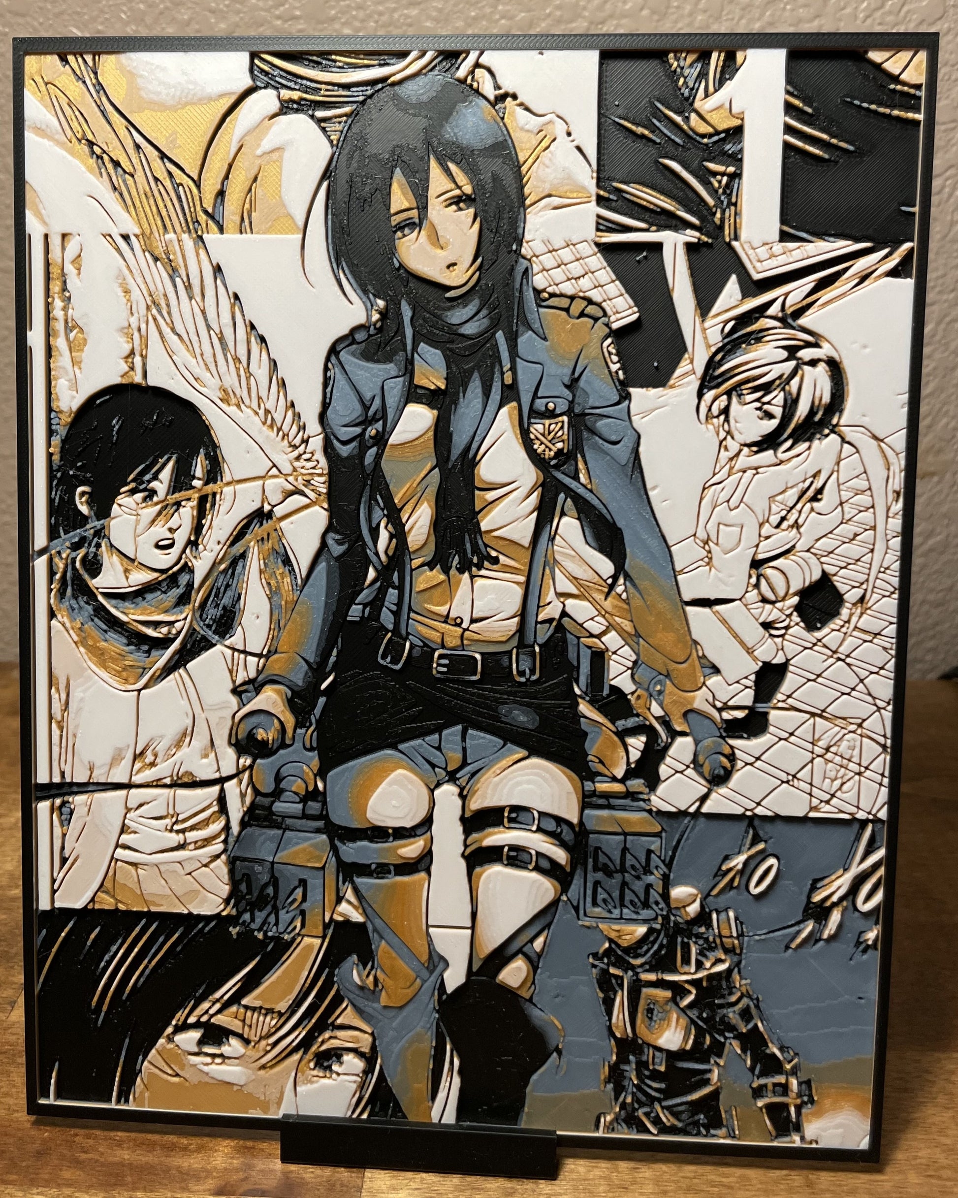 Print inspired by Mikasa Ackerman from Attack on Titan, presented in a vibrant layered style that emphasizes her calm intensity, Survey Corps gear, and powerful presence among the panel-style background. Layer depth brings out the intricate shading, bold outlines, and dramatic composition that define this fan-favorite warrior.