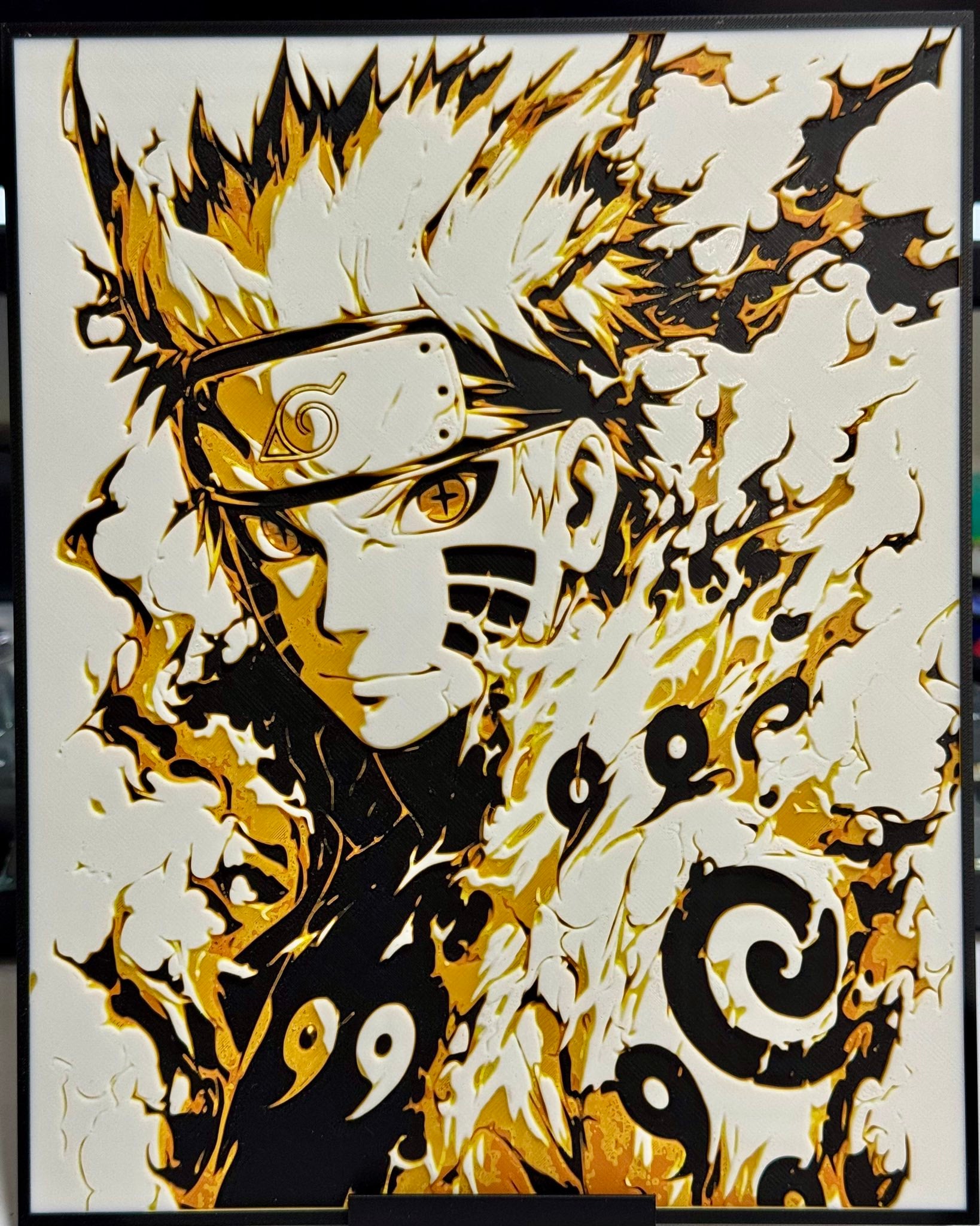 Print inspired by Naruto Uzumaki in his powerful Nine-Tails Chakra Mode from Naruto Shippuden, surrounded by swirling flames, glowing markings, and the iconic sage-enhanced cloak. Layered depth and bold contrast bring out the energy, motion, and spiritual intensity of this transformation.