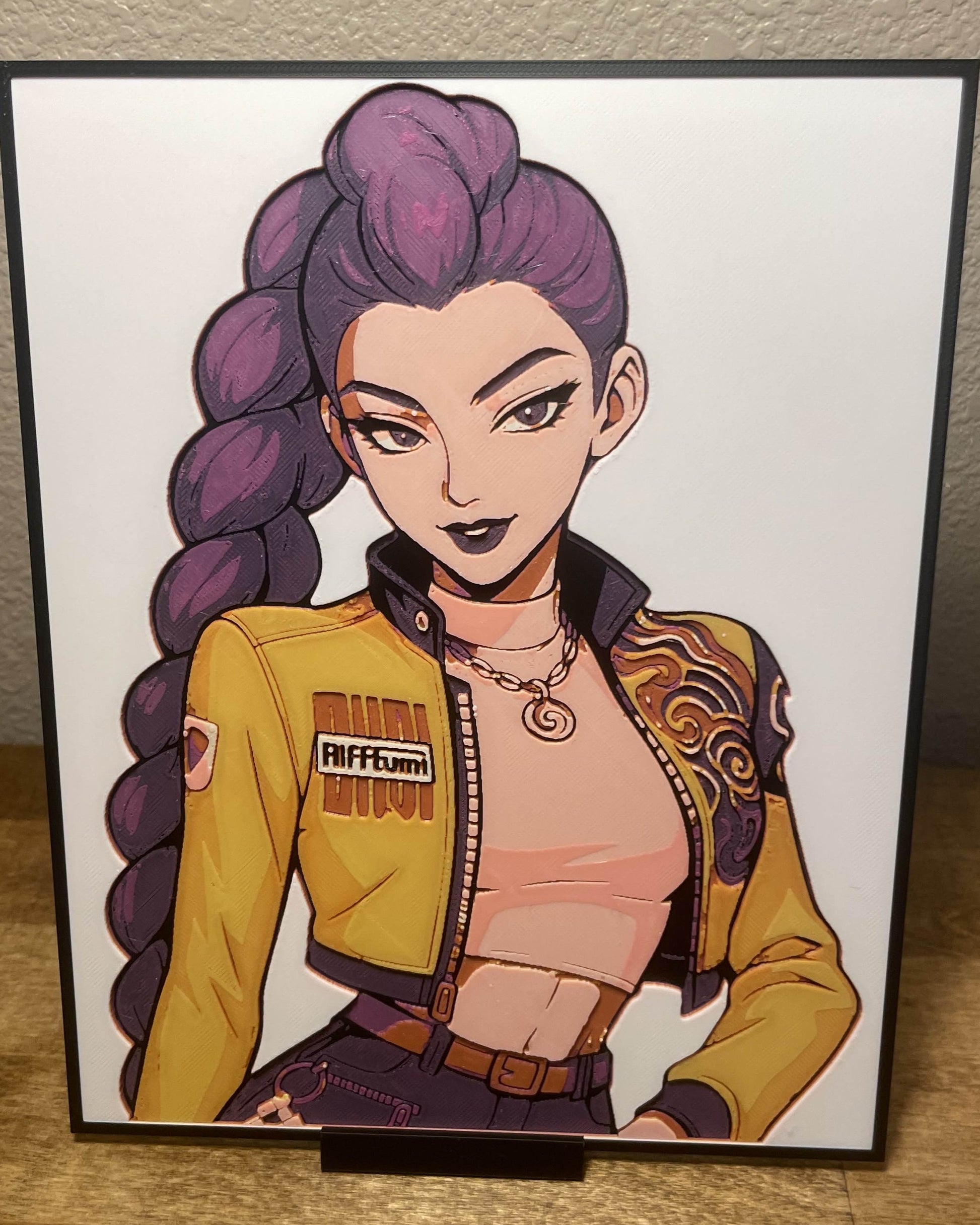 A layered 3D Strata Print inspired by Rumi, blending slick K-pop energy with bold demon-hunter attitude. Her deep violet braid, sharp winged eyeliner, and gold-trimmed jacket pop through layered filament depth, giving the piece a vibrant, modern look. Subtle textures in the hair, jacket embroidery, and jewelry add a premium, dynamic feel, making her stand out as a stylish fighter with real presence.