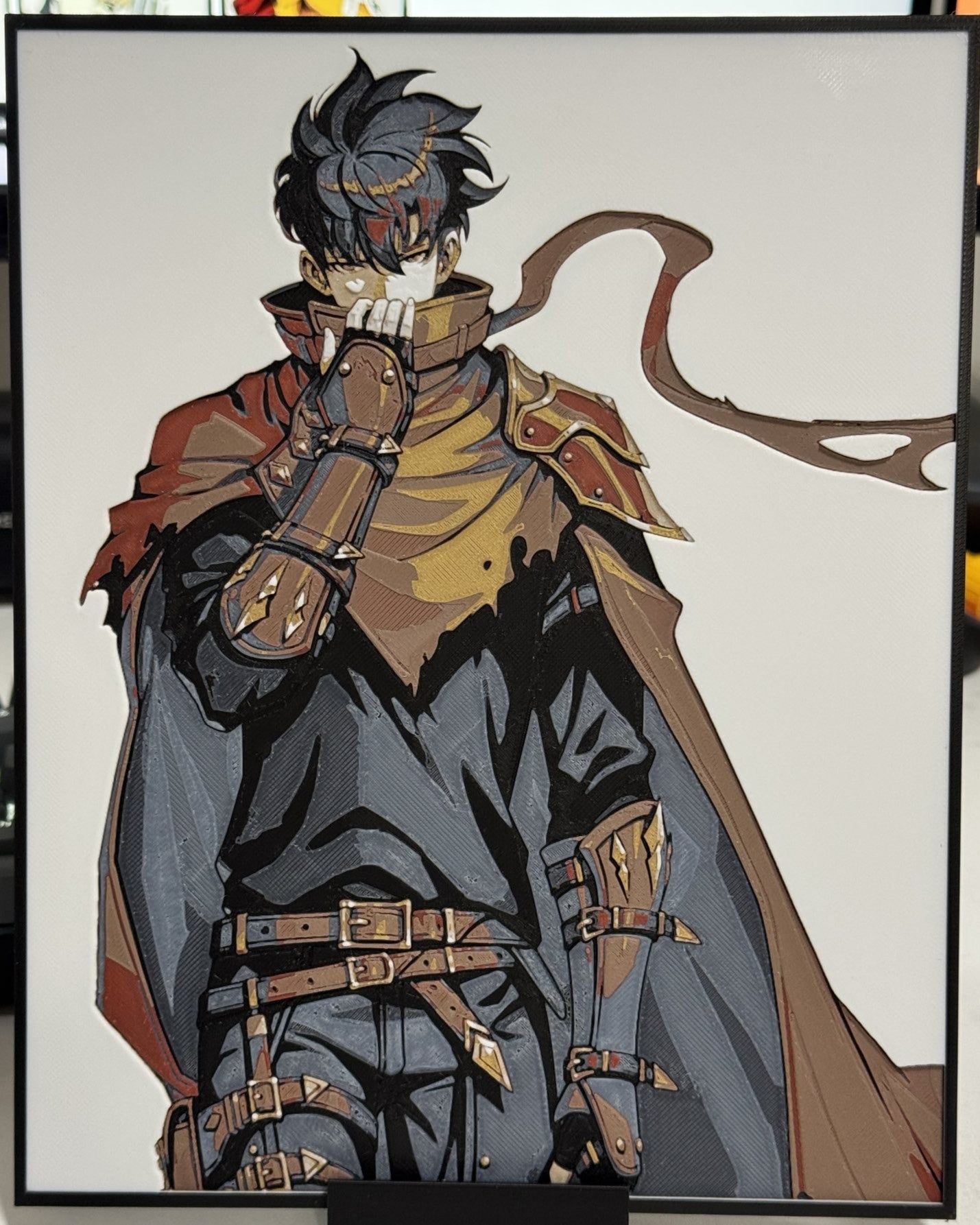 Print inspired by Sung Jinwoo from Solo Leveling, portraying him in his early shadow-hunter gear with a tattered cloak, layered belts, and armored gauntlets. Layer depth brings out the rugged textures, muted reds, and dark grays while emphasizing his intense, focused expression. The flowing scarf and detailed outfit give the piece a dramatic, adventurer-style presence true to Jinwoo’s transformation.